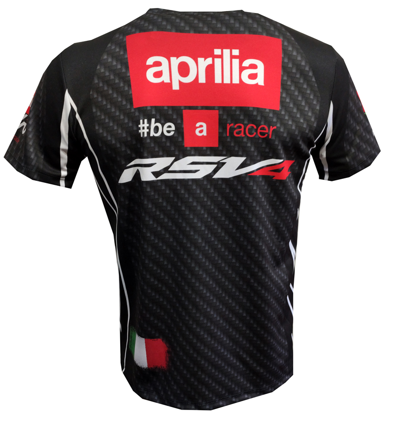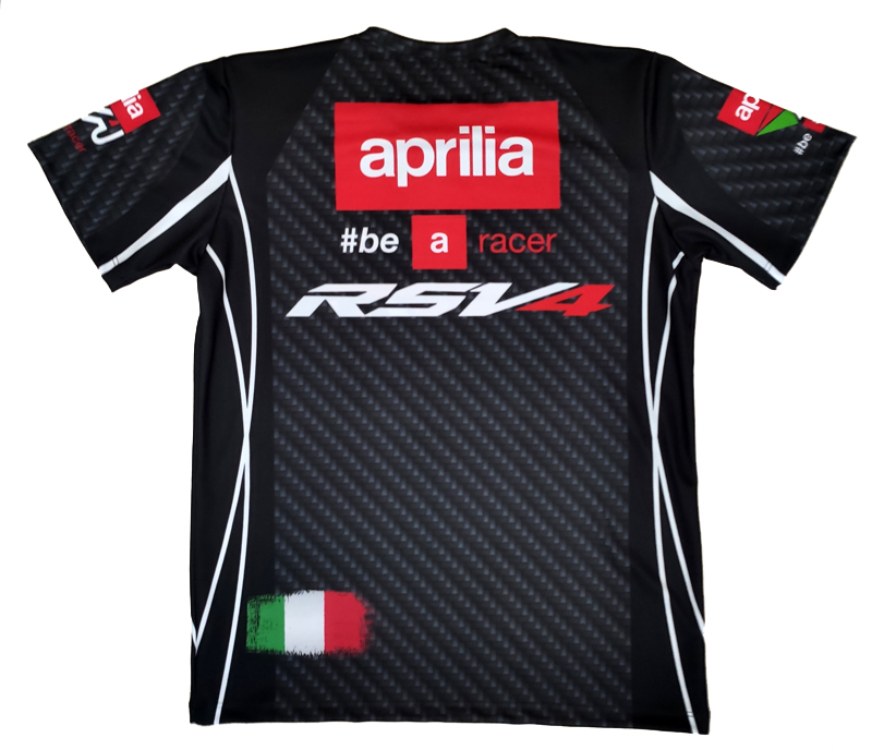 This "Aprilia RSV4" t-shirt is fully and overall printed with the highest and finest printing technology available, called sublimation. This is the only way to achieve such a cool look and it also makes the colors of the print last much longer. This t-shirt is made of 100% breathable polyester and it is very light and comfortable to wear.